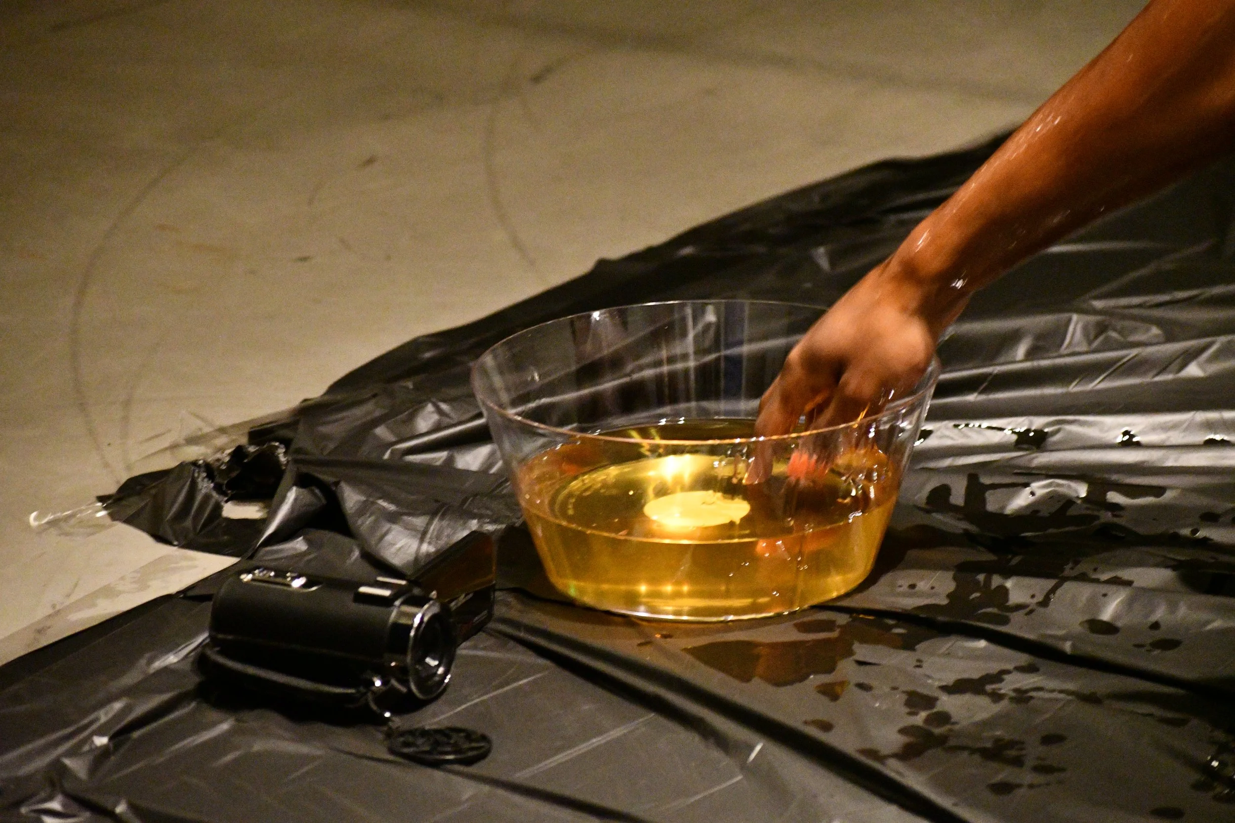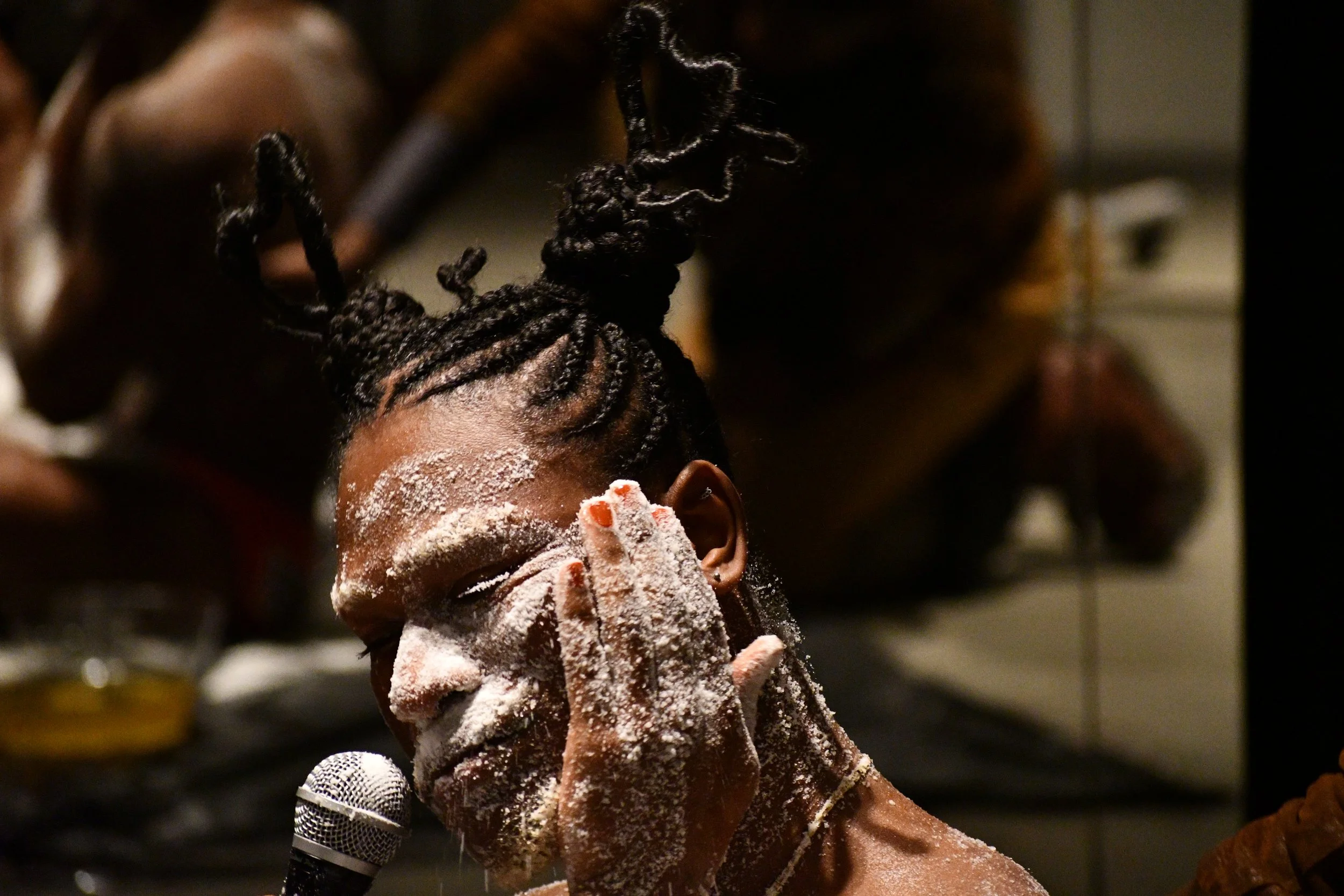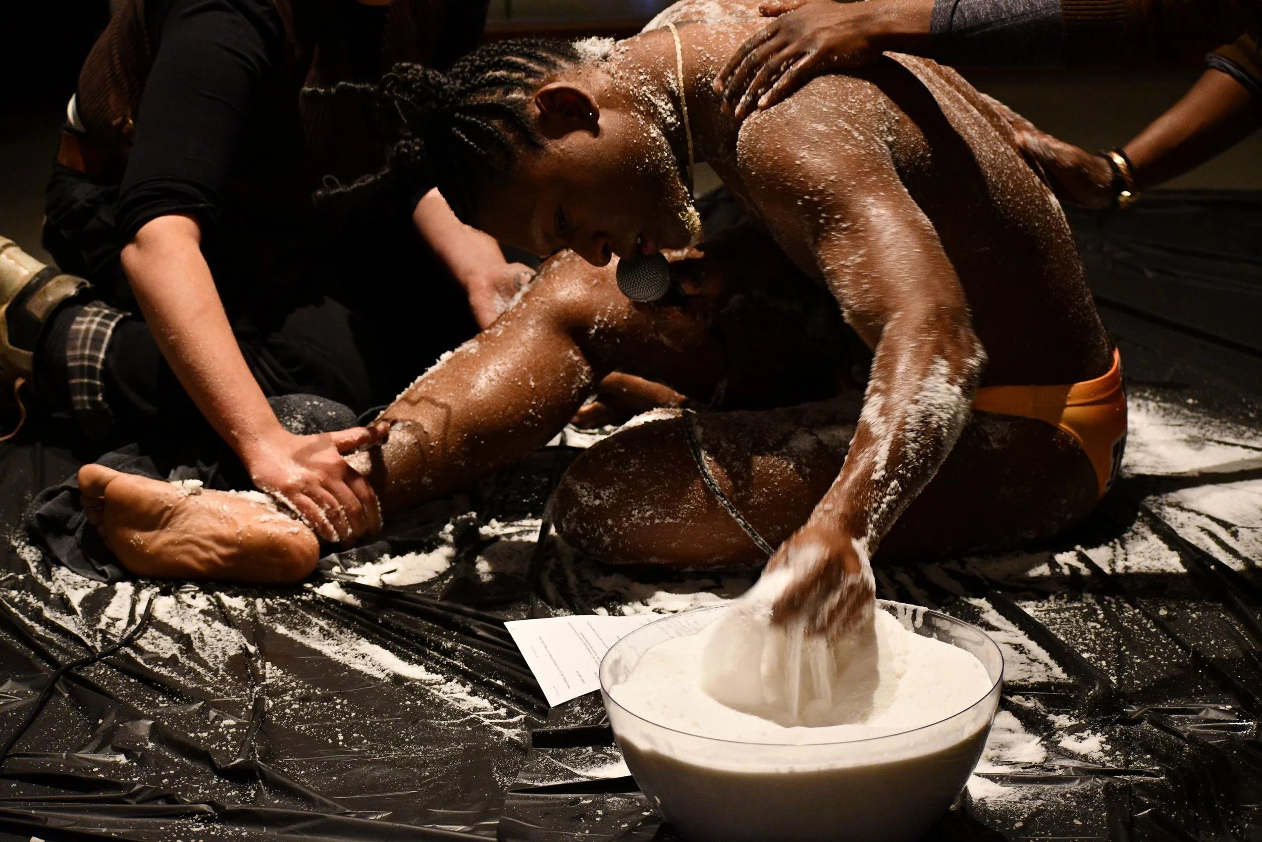 Suga’N’Tanks is a live art interactive performance that invites the audience to rub cane sugar and canola-corn-peanut oil onto Immanuel J. while they recite a mantra– hazy memories littered with embellishments.