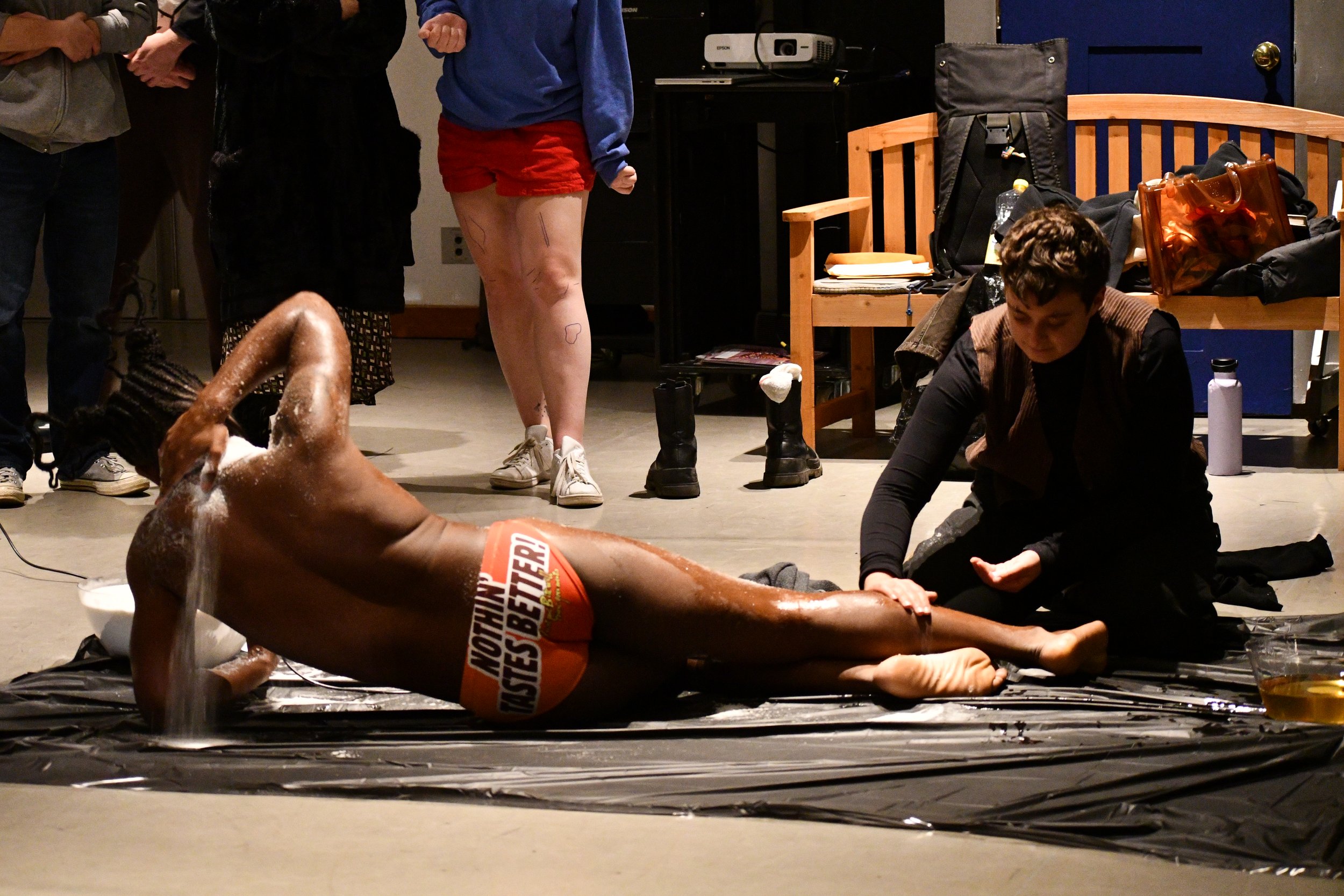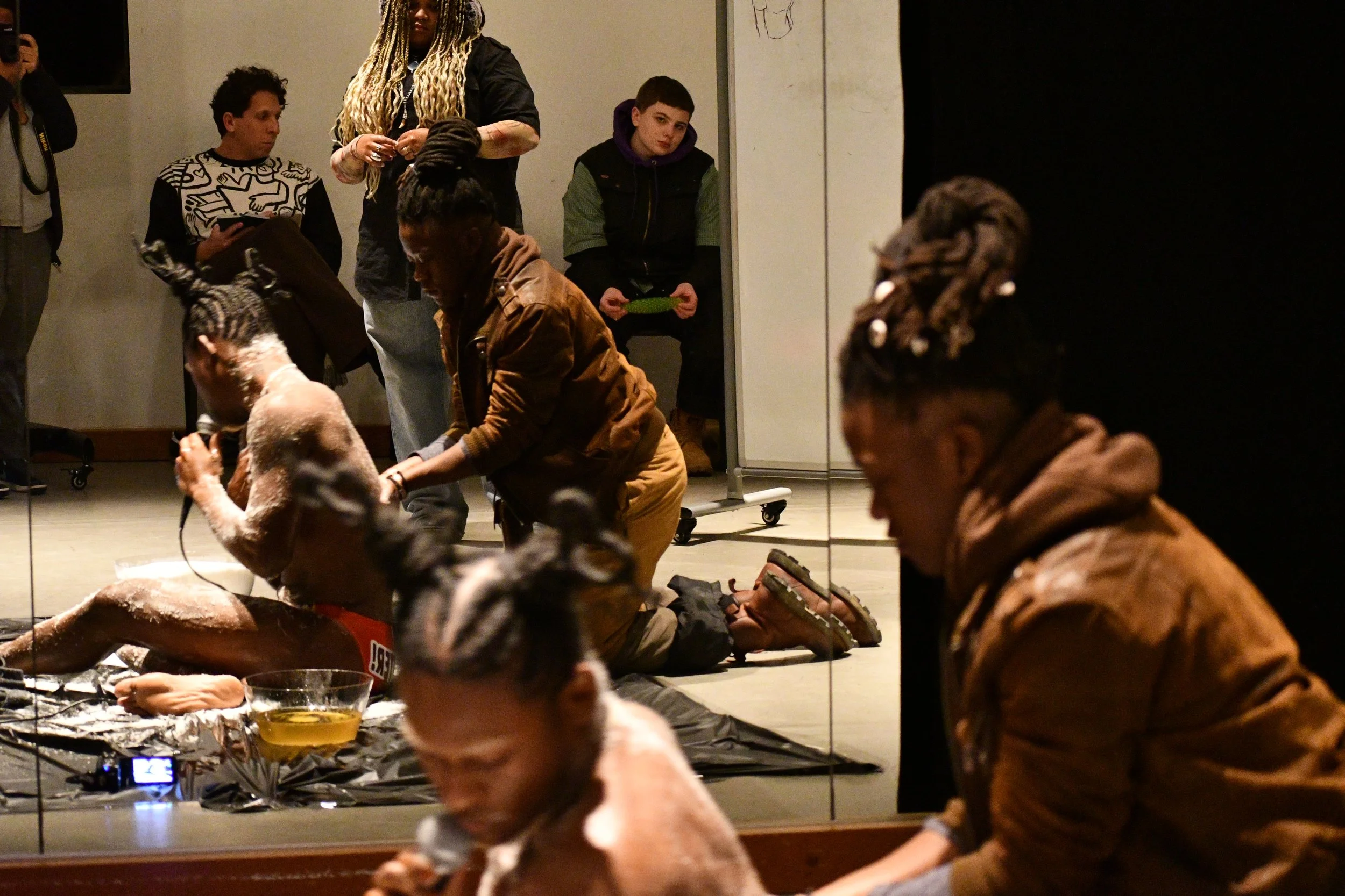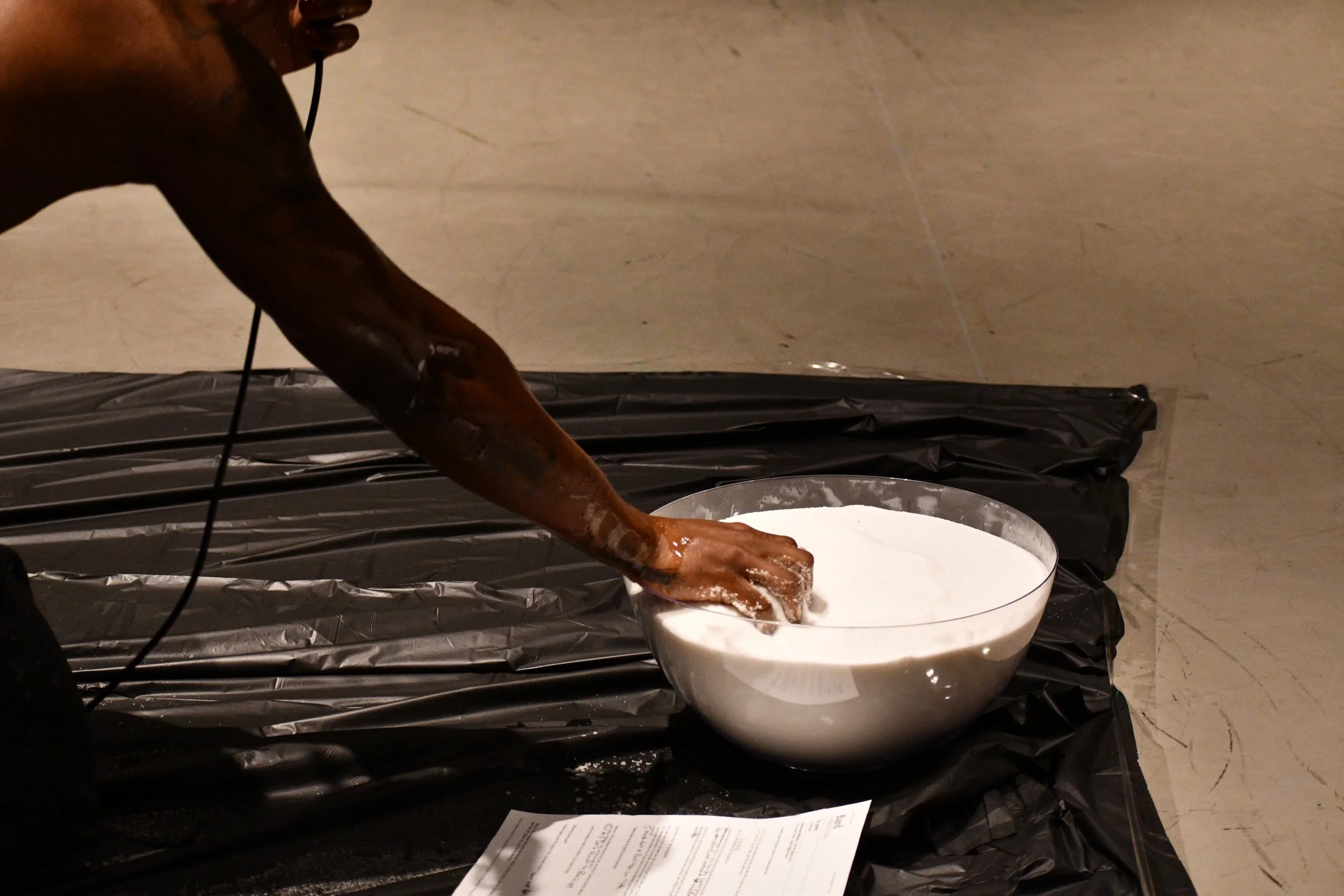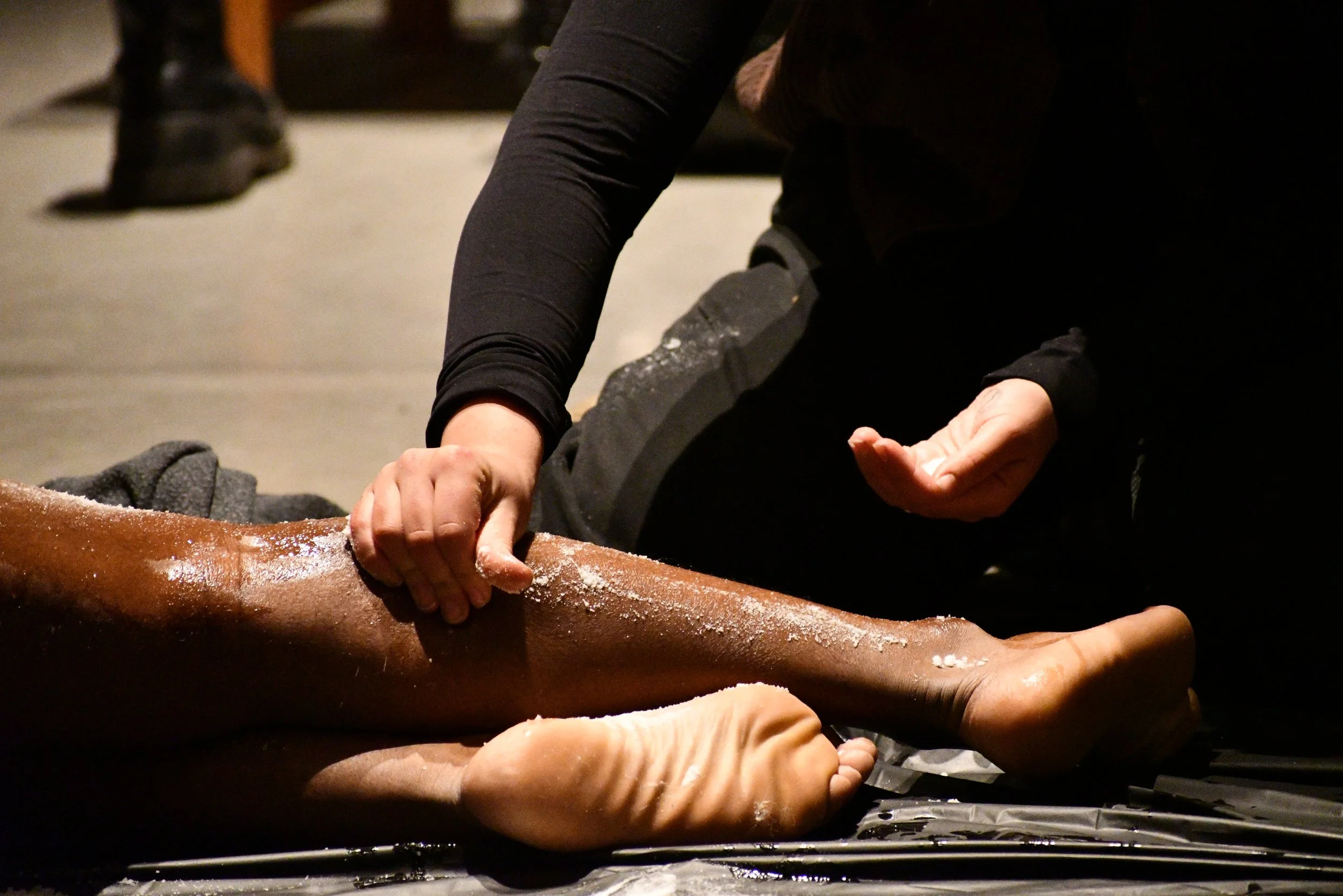 Immanuel J. renders themself vulnerable for audience members to act on their own volition; scrub as hard, or soft or not touch J. 's flesh at all. This is all done in an effort to create a sense of connectivity through a sensory experience; activating four of five senses through smell, touch, sound, and sight.